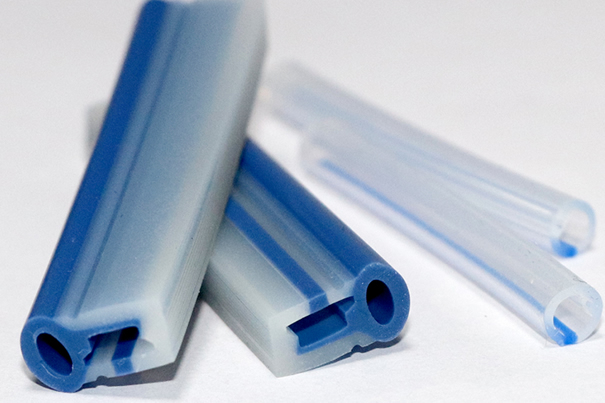 擠出機(jī)頭也是產(chǎn)品的截面形狀,有一定長(zhǎng)度,在力與溫度的作用下,機(jī)頭出來(lái)產(chǎn)品經(jīng)過高溫硫化成型。此工藝成型的產(chǎn)品一般是條形的產(chǎn)品,產(chǎn)品截面可以各種各樣。譬如,矩形長(zhǎng)條,環(huán)形硅管,等.